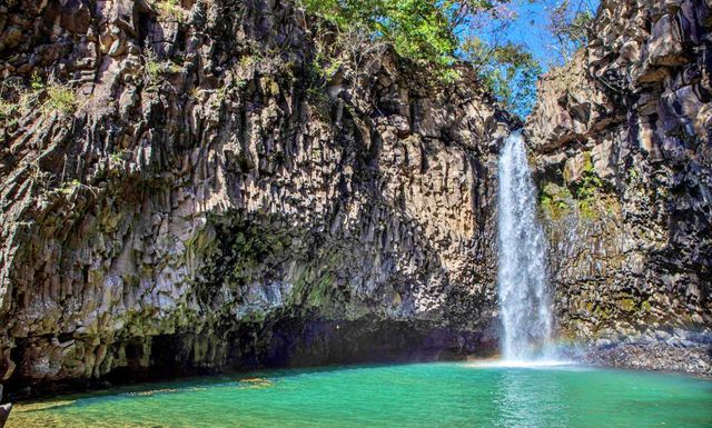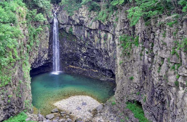 신생대 제4기에 분출한 용암은 한탄강 물줄기를 따라 흐르다 이곳에서 멈춰 섰다. 뜨거운 액체였던 현무암질 용암은 식어가는 과정에서 육각형 기둥 모양의 주상절리를 형성했고, 오랜 침식 작용을 거치며 오늘날의 깊은 협곡과 폭포를 완성했다. 약 18m 높이에서 수직으로 떨어지는 물줄기는 검은 현무암 벽과 대비돼 더욱 희게 보인다. 폭포 아래에는 오랜 시간 물살이 소용돌이치며 깎아낸 수심 5m 규모의 커다란 구멍인 포트홀이 자리하고 있다. 이곳에 고인 물은 보는 각도에 따라 비취색이나 에메랄드빛을 띠며 신비로운 분위기를 자아낸다. 계절과 날씨에 따라 물빛과 주변 풍경의 인상도 조금씩 달라져, 같은 장소라도 찾는 때마다 다른 표정을 보여주는 점이 이곳의 또 다른 매력이다.