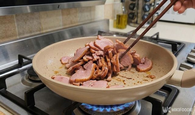3. 예열된 팬에 기름을 두르지 않고 훈제 오리를 넣어 볶는다.