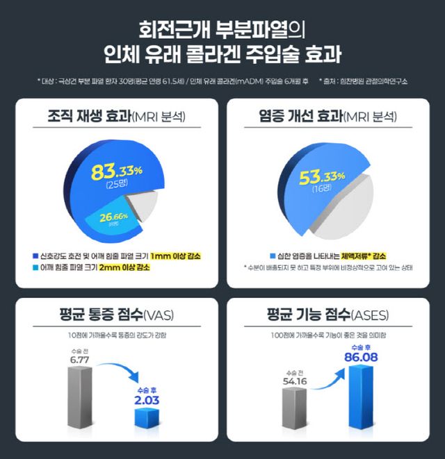 회전근개 부분 파열 시 주로 시행하는 견봉성형술은 힘줄을 자극하는 어깨뼈(견봉)를 다듬어 어깨 관절 내 공간을 넓혀주는 방식이다. 힘줄에 가해지는 물리적 마찰을 줄여 통증 완화, 어깨 관절 기능 개선과 더불어 파열 속도를 늦추는데 효과적인 치료법이지만 손상된 힘줄 자체의 구조적 회복을 직접적으로 유도하기에는 한계가 있었다. 이에 따라 견봉성형술과 같은 물리적 공간 확보 외에, 파열된 힘줄 조직에 직접 작용하는 콜라겐 주입술의 치료 효과에 대한 임상적 검토가 활발히 이루어지고 있다.