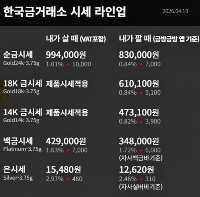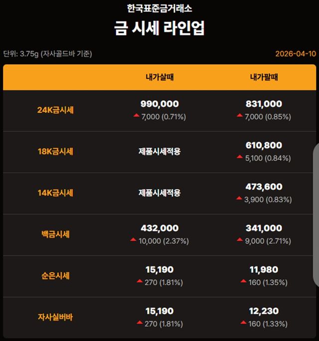 국내 금시세(금값)가 10일(이하 한국 시각) 오후 상승세(전 거래일 대비)를 보이고 있다.