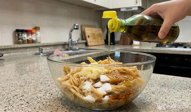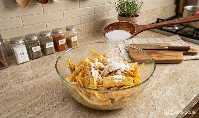 양념: 들기름 3큰술, 설탕 1큰술, 간마늘 2큰술, 참치액 1큰술, 고춧가루 1큰술
