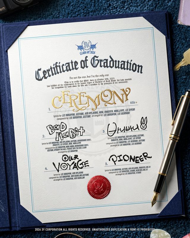 이날 공개된 트랙리스트 이미지는 졸업 증명서를 본뜬 디자인으로 만들어졌다. 또 각 수록곡 제목이 마치 서명처럼 손글씨로 쓰여 있어 시선을 사로잡는다.