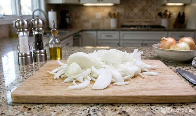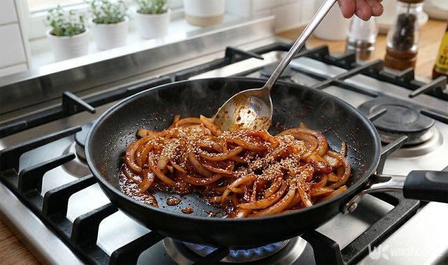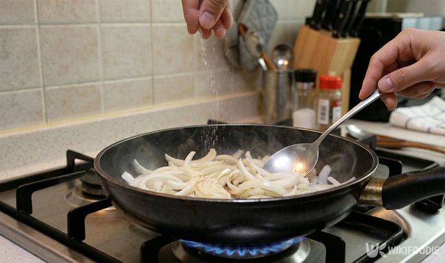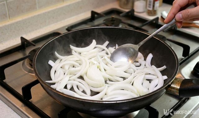 팬에는 식용유를 넉넉히 두른다. 양파는 수분이 많아 기름이 모자라면 타기 쉽다. 기름이 알맞게 있어야 부드럽게 익으면서 겉면이 노릇해진다. 처음부터 센 불을 쓰지 말고 중간 불에서 천천히 익혀야 양파 자체의 단맛이 자연스럽게 배어 나온다. 불이 너무 세면 겉만 타고 속은 생생하므로 주의해야 한다.