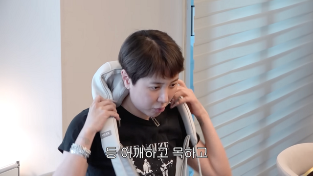 어깨 위에 툭 얹어둔 저 물건은 또 뭐냐고? 바로 사람이 직접 주무르는 듯한 입체적인 움직임을 보여주는 어깨 마사지기다. 마사지 볼이 제자리에서 도는 게 아니라, 근육을 직접 잡고 당기는 것처럼 움직여 승모근 깊숙한 곳까지 시원하게 풀어주는 것이 포인트. 등 뒤로 고정하는 버클 덕분에 두 손이 자유로워 마사지 받으면서 스마트폰을 보거나 가벼운 집안일을 하기에도 딱이겠다. 따뜻한 온열 기능까지 더해졌으니 굳어 있는 목 근육 이완시키기엔 이만한 효자템이 없다.