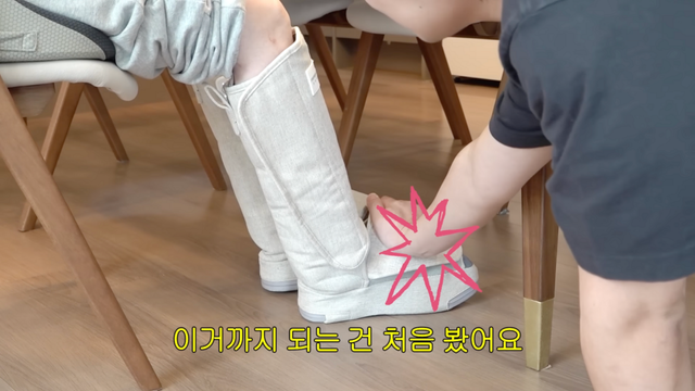거실 소파 위에서 포착된 다리 마사지기. 흔히 보던 종아리 밴드 형태가 아니라, 무릎 아래부터 발가락 끝까지 통째로 집어넣는 장화 같은 비주얼이 특징이다. 5개의 공기 주머니가 분리되어 있어 종아리 근육은 물론 아킬레스건과 발등까지 공기압으로 세밀하게 눌러준다고. 펌프 힘이 워낙 강력해 다리를 짱짱하게 조여주니, 하루 종일 힐 위에서 고생한 다리 피로 풀기에 이만한 게 없을 듯! 게다가 무선이라 거실이든 침대 위든 장소 구애 없이 쓸 수 있는 점이 매력적이다.