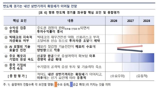향후 반도체 경기를 좌우할 핵심 요인으로는 △AI 투자의 수익성 검증 △빅테크의 자금 여력 △기술 효율성 △공급 증설 속도 △중국의 추격 등 5가지를 꼽았다. 빅테크 재무 건전성 악화나 AI 기술 효율화가 빠르게 진행될 경우 경기 전환이 앞당겨질 수 있다. 또 중국 메모리 기업은 현재 국내 기업 대비 기술이 4년 뒤처져 있지만, D램 공급 증가 속도는 국내 기업의 3배 이상 빠를 전망이다.