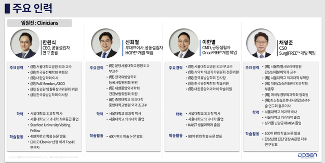 신 부대표는 분당서울대병원 외과 부교수로 디시젠 법인 설립부터 7년간 대표를 맡아 팁스(TIPS), 시리즈A 투자 등 초기 투자와 성장을 김홍섭 공동대표와 함께 이뤄냈다. 신 부대표는 호프(HOPE) 및 호프스코어(HOPE Score) 개발을 주도했다. 채영준 CSO는 보라매병원 교수이자 서울대 의대 부학장으로 원천기술 개발의 핵심 엔진 역할을 수행하고 있다.