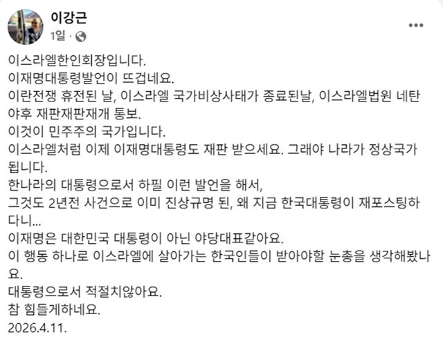 이강근 이스라엘 한인회장은 11일 페이스북 게시글에서 "이재명 대통령의 발언이 뜨겁다"고 운을 뗀 뒤 "이 행동 하나로 이스라엘에서 살아가는 한국인들이 받아야 할 눈총을 생각해 봤나"고 물었다.