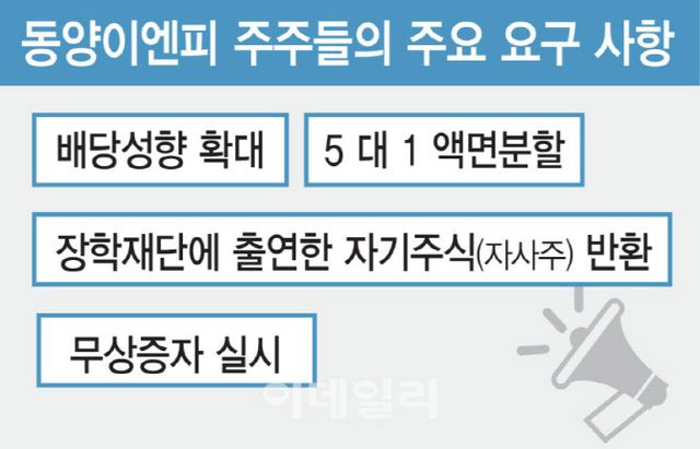 또 회사 측이 과거 2020년 당시 약 65억원(39만 319주) 규모의 자사주를 김재만 동양이엔피 대표가 직접 설립하고 이사장으로 있는 장학재단에 출연한 것도 문제 삼고 있다. 대주주 명의의 장학재단이 회사의 우호 지분으로 악용될 수 있으며, 무엇보다 자사주 소각 의무화 법까지 도입된 상황에서 흐름에 역행한다는 지적이다.