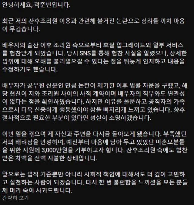 이어 배우자의 출산 이후 산후조리원 측으로부터 호실 업그레이드와 일부 서비스를 협찬받았다고 설명했다. 사회관계망서비스를 통해 협찬 사실도 알렸지만 구체적인 협찬 범위를 충분히 설명하지 못해 오해를 불러올 수 있었다는 점을 뒤늦게 인지했고 이후 관련 내용을 수정했다고 밝혔다.