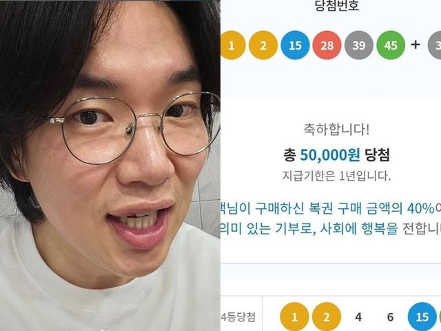 공개된 사진에는 로또 당첨 번호와 함께 ‘총 50,000원 당첨’이라는 결과 화면이 담겨 눈길을 끈다.