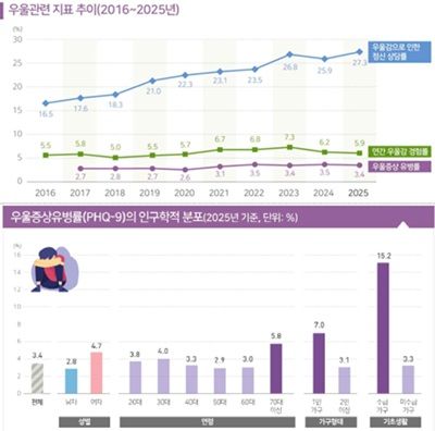 반면 우울감 경험자 중 전문가 상담을 받은 비율인 정신건강 상담률은 2016년 16.5%에서 2025년 27.3%로 크게 늘었다.