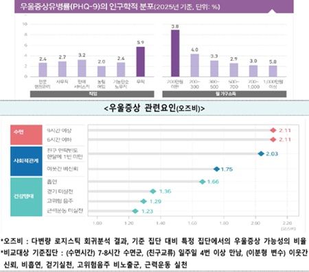 직업별로는 무직자가 전체 대비 1.7배, 소득별로는 월 가구소득 200만원 이하 계층이 2.6배 높은 유병률을 보여 사회경제적 취약성이 우울 위험과 밀접하게 관련돼 있었다.