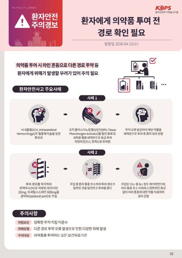 이번 경보는 실제 의료 현장에서 발생한 ‘투여 경로 오류’ 사례를 중심으로 구성됐다. 약물을 정해진 경로가 아닌 다른 방식으로 투여할 경우 심각한 부작용이나 합병증으로 이어질 수 있어 각별한 주의가 요구된다.