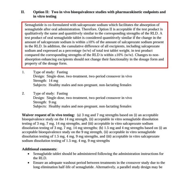 실제로 2025년 10월 개정된 FDA 세마글루타이드 가이드라인(Draft Guidance on Semaglutide)에 따르면 '세마글루타이드는 경구 투여 후 흡수를 촉진하는 살카프로제이트 나트륨(salcaprozate sodium, SNAC)과 함께 제형화돼 있다. 따라서 시험 의약품이 기준 의약품(RLD)의 해당 강도와 정성적으로 동일하고 정량적으로 유사한 경우에 한해 옵션2가 허용된다'고 기재돼 있다.