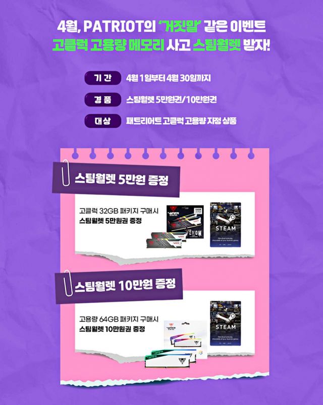 PC 메모리와 SSD 등 반도체 부품 유통 전문기업 파인인포가 PATRIOT 고성능 DDR5 메모리 지정 제품 구매 고객을 대상으로 스팀 월렛 증정 프로모션을 진행한다고 밝혔다.