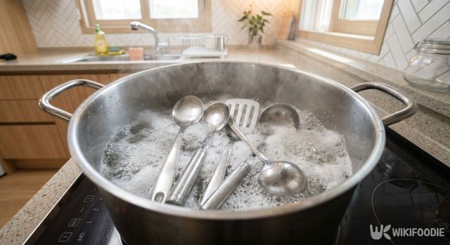 혼합물을 일일이 바르기 번거로운 작은 수저류나 틈새가 많은 주방 도구는 열탕 소독하는 것이 효율적이다. 커다란 냄비에 물을 넉넉히 담아 팔팔 끓인 뒤, 베이킹소다 한 스푼을 크게 떠서 넣어주면 물속에서 기포가 발생하며 세척력이 생긴다. 이때 관리가 필요한 스테인리스 제품들을 끓는 물 속에 모두 집어넣는데, 뜨거운 온도가 금속 틈새에 끼어 있던 기름때와 미세한 이물질을 유연하게 만들어 밖으로 밀어내게 된다.
