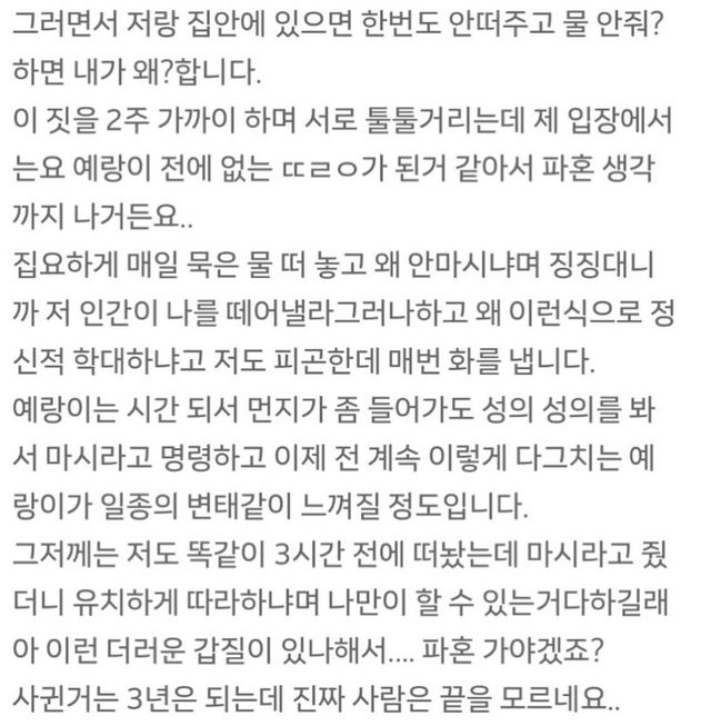 예랑은 작성자가 집에 없을 때 미리 물을 따라놓고, 귀가한 작성자에게 그것을 마시라고 강요합니다. 작성자가 "따뜻한 물을 마시고 싶다"거나 "2~3시간 전에 떠놓아 차갑게 식고 먼지 앉은 물을 왜 마셔야 하느냐"고 항의하며 물을 버리면, 예랑은 "성의를 무시한다"며 화를 냅니다. 심지어 예랑은 "나랑 있으면 물 한 번 안 떠주느냐"고 적반하장격 태도를 보이며, 먼지가 들어갔어도 성의를 봐서 마시라는 명령조의 발언까지 서슴지 않았습니다. 작성자는 이러한 예랑의 행동이 일종의 '변태적 갑질'처럼 느껴지며, 3년의 연애 기간이 무색하게 "사람은 끝을 모른다"며 파혼 의사를 드러냈습니다.