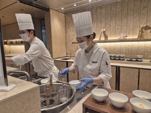 [인천=이데일리 이윤화 기자] 인천공항 제2여객터미널 대한항공 프레스티지 서편 라운지. 입구를 지나자마자 한옥의 중정(마당)과 기둥, 보에서 영감을 받은 디자인 요소들이 적용된 널찍한 홀이 펼쳐졌다. 셰프가 즉석에서 요리를 완성하는 라이브 스테이션에서는 김이 모락모락 올라왔다. 한쪽에는 디저트와 전통 다과가 정갈하게 놓여 있고, 다른 한편에서는 바텐더가 칵테일을 포함한 음료를 정성껏 만들어 전달했다. 공항 라운지라기보다 5성급 호텔 라운지에 가까운 분위기였다.