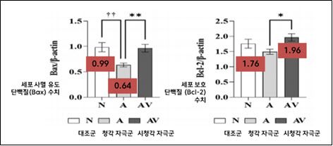 사멸을 유도하는 단백질(Bax)은 대조군(0.99) 대비 청각 자극군(0.64)에서 약 35% 감소했다. 반면 세포를 보호하는 단백질(Bcl-2)은 대조군(1.76)보다 시청각 복합 자극군(1.96)에서 증가했다.