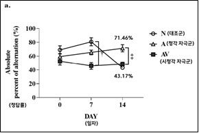 이후 소음이 차단된 환경에서 40Hz 주파수의 소리와 빛 자극을 하루 2시간씩 14일 간 제공했다. 그 결과, 공간 기억력을 평가하는 ‘행동검사(Y-maze)’에서 40Hz 자극군의 정답률은 71.46%로, 치료를 받지 않은 대조군의 정답률 43.17%를 크게 앞질렀다.