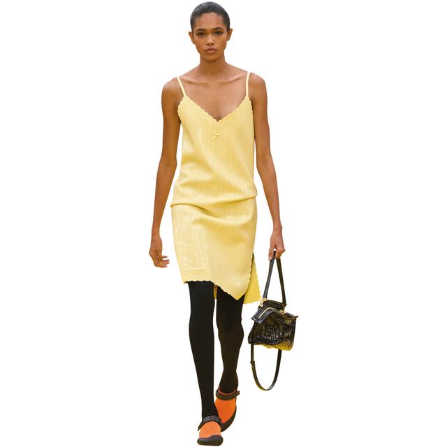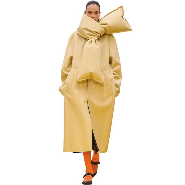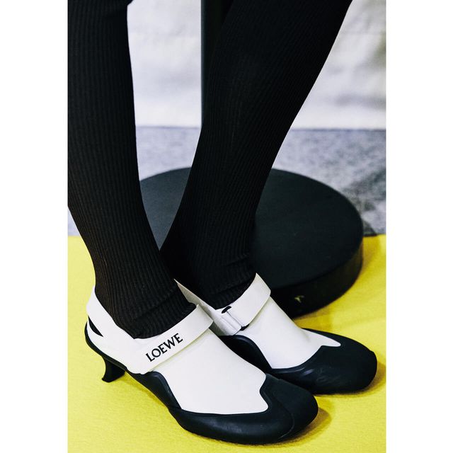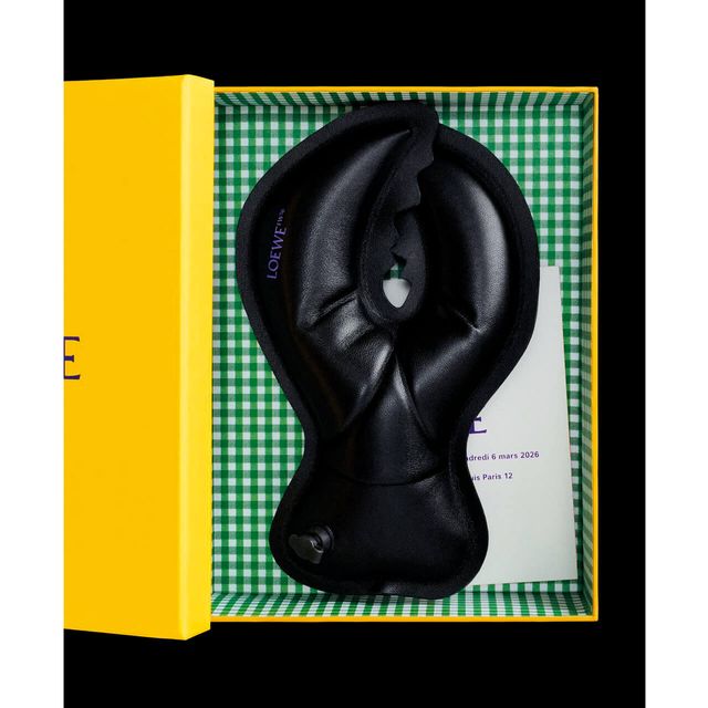 파리 생루이 광장에 위치한 뱅센성 내부, 초록색 체크 패턴으로 둘러싸인 정육면체 공간에서 로에베의 2026 F/W 컬렉션이 공개되었다. 밝은 노란색 바닥에 놓인 화이트 큐브 형태 체어 위에 소라게, 조개, 강아지 조형물을 배치해 유머러스한 분위기를 자아냈다. 이는 독일 아티스트 코시마 폰 보닌의 작업에서 비롯된 요소로, 쇼 공간과 컬렉션 전반에서 위트를 느낄 수 있었다. 크리에이티브 디렉터 잭 맥콜로와 라자로 에르난데스는 로에베에서 선보이는 두 번째 컬렉션을 통해 창작의 본질에 대한 생각을 드러냈다. 그들에게 ‘만드는 행위’는 결과보다 과정에 가깝다. 기쁨과 호기심에서 출발한 제작 과정은 장난기와 실험, 그리고 장인 기술이 교차하는 지적 탐구의 장이 되었다. 잭 맥콜로는 “우리는 장인정신의 한계를 넘어 그것을 동시대적으로 재해석하는 방법을 찾는 데 큰 의미를 둡니다. 손과 기계가 어떻게 조화를 이뤄 이전에 없던 새로운 것을 만들어낼 수 있는지를 고민하죠”라고 설명했다. 라자로 에르난데스 역시 “뭔가를 만드는 과정에서 느끼는 즐거움, 바로 그 디자인의 기쁨이 우리에게 매우 중요합니다”라고 덧붙였다. 이번 컬렉션의 실루엣은 중력과 소재, 그리고 인식의 경계를 유희적으로 탐색했다. 오프닝에 등장한 레이스와 리본 장식 슬립 드레스는 란제리 모티브에서 출발했지만, 3D 프린팅 구조에 광택과 점성을 지닌 라텍스를 입히며 전혀 다른 물성을 만들어냈다. 코트 역시 소매와 포켓, 여밈 장치에 이르기까지 각각의 요소를 몰딩해 라텍스에 트롱프뢰유 효과를 구현하며 조각적 구조를 완성했다. 일부 아이템은 액체처럼 흐르던 텍스처가 굳어가는 순간을 포착한 듯 보였고, 또 다른 아이템은 공기를 머금은 듯 부풀어 오른 형태를 드러냈다.