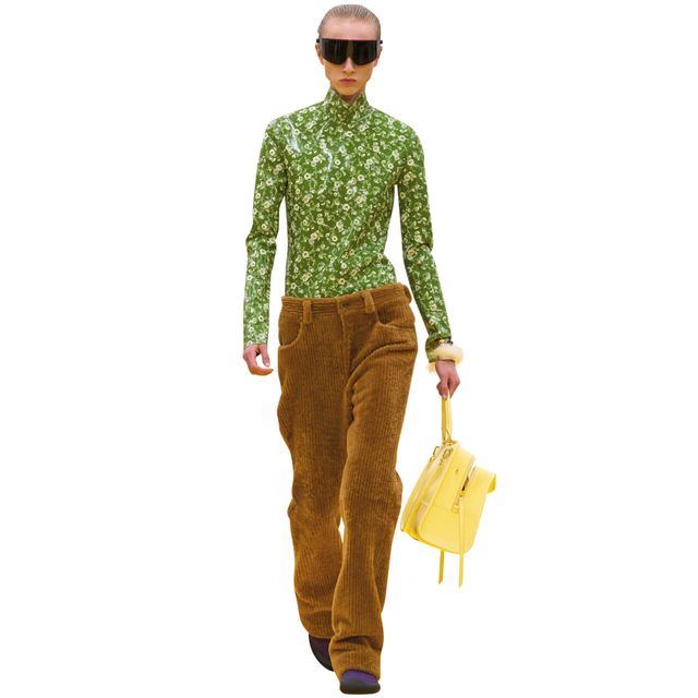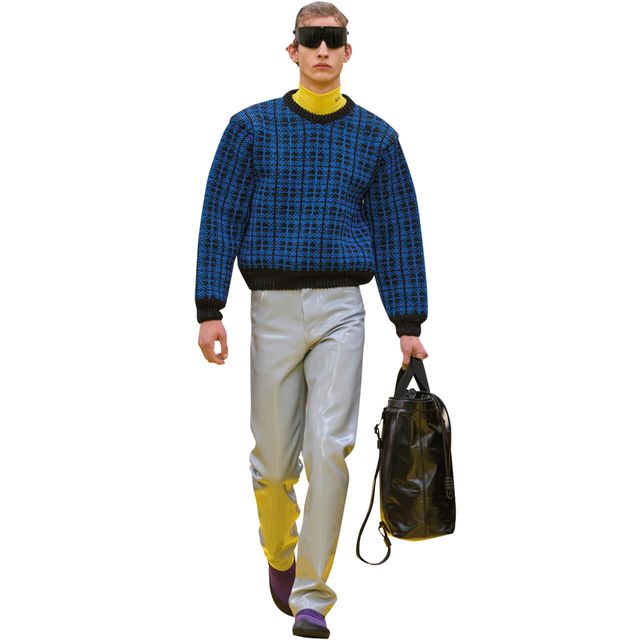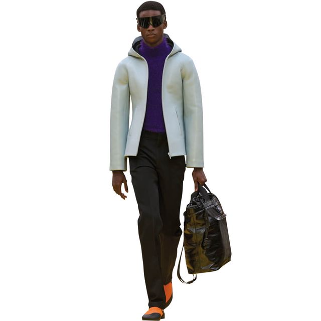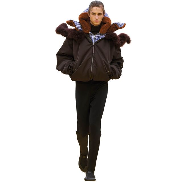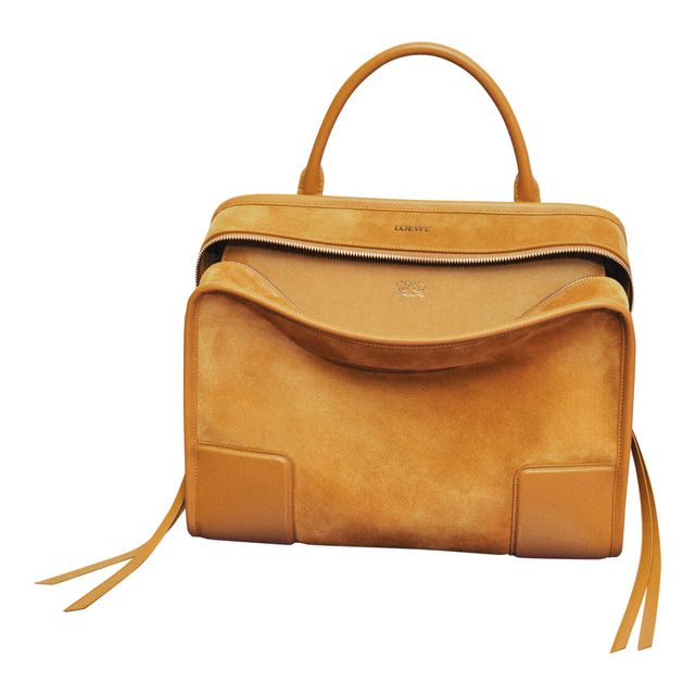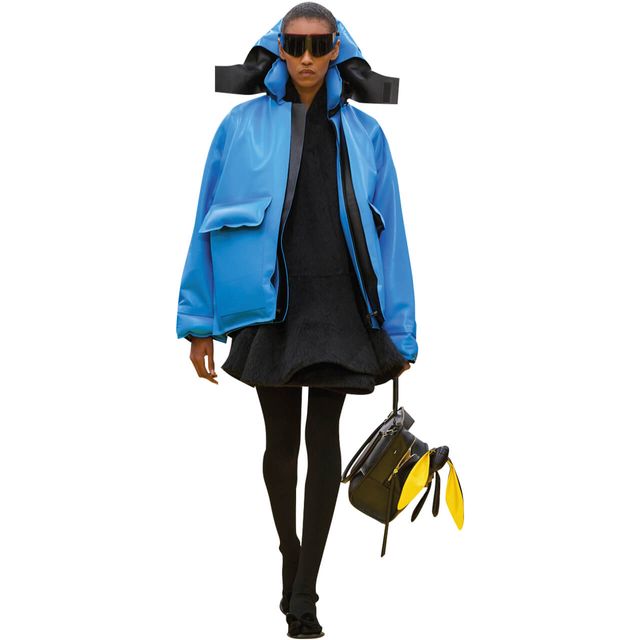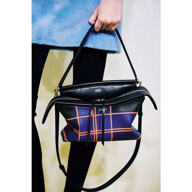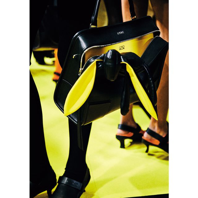 소재 실험 또한 두드러졌다. 레이저 커팅과 본딩 공정을 통해 제작한 파카와 스카프는 공기층을 품은 볼륨감을 형성했고, 래커 처리한 가죽으로 만든 루프 코트와 초극세 가죽 원사로 편직한 니트웨어는 하우스 특유의 공예적 접근을 보여줬다. 시어링과 코듀로이 소재에는 그러데이션 트리밍을 적용해 예상치 못한 텍스처의 변화를 더했다. 코시마 폰 보닌의 작업은 컬렉션 곳곳에 흥미로운 흔적을 남겼다. 그녀가 그린 플로럴과 깅엄 패턴은 룩의 안감과 라텍스 표면에 등장했고, 개와 갑각류 형태의 조각 동물은 미니백과 참 장식으로 재해석되었다. 이러한 디테일은 레디투웨어와 액세서리를 자연스럽게 오가며 컬렉션의 완성도를 높였다. 올해 창립 180주년을 맞아 아마조나 180 백도 함께 선보였다. 개와 게 모양 참 장식을 더한 백은 더플백 형태로도 확장되었다. 또 다른 하우스 아이콘인 플라멩코 클러치백은 블루와 화이트 모자이크에서 영감받은 인타르시아 가죽 마케트리 기법으로 재해석되었고, 새롭게 공개된 위스커 백은 구조적 상단과 유연하게 흐르는 보디라인이 대비를 이루며 우아한 실루엣을 드러냈다. 유머와 위트, 그리고 공예에 대한 집요한 탐구 과정 자체가 하나의 창의적 놀이처럼 펼쳐진 실험적 시도와 흥미로운 내러티브, 위시 리스트를 업데이트하게 만드는 아이템까지 갖춘 크리에이티브 듀오의 성공적 행보. 로에베의 다음 챕터를 기대하게 만드는 유쾌한 시간이었다.