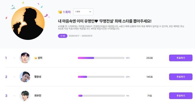 특히 ‘국민의 선택’ 투표에서는 성리가 4주 연속 1위에 오르며 막강한 팬덤 화력을 입증했다. 황윤성, 김한율, 유지우 등도 꾸준히 상위권에 이름을 올리며 팬들의 뜨거운 응원을 받고 있다. 이처럼 ‘무명전설’ 출연자들이 뜨거운 주목을 받고 있는 가운데, 팬 투표 서비스 기프트리에서는 4월 17일부터 5월 15일 오후 5시까지 ‘무명전설 최애 트로트스타’ 투표를 진행한다.