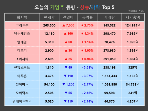 크래프톤이 금일(17일) 전거래일 대비 2.73%(7,000원) 상승한 263,500원에 거래를 마쳤다. 개인과 외국인이 각각 19,623주, 11,051주를 순매도한 반면, 기관이 29,564주를 순매수하며 종일 상승장을 기록했다.