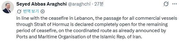 아바스 아라그치 이란 외무장관은 이날 X(엑스·옛 트위터)에 “(이스라엘과) 레바논 휴전 기간에 모든 상업용 선박의 호르무즈 해협 통항이 전면 허용된다”며 “다만 이는 이슬람공화국 항만과 해사 기관이 이미 발표한 협조된 항로를 따라야 한다”고 올렸다.