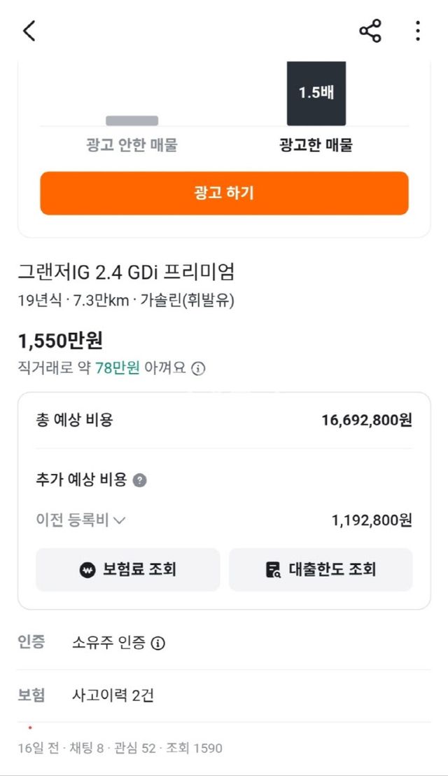 차량 평가와 경매가 진행되는 1~2주 기간 동안 당근마켓에도 같은 차를 올려봤다. 아무래도 개인 간 직거래가 더 높은 가격을 받을 수 있다는 판단에서다.