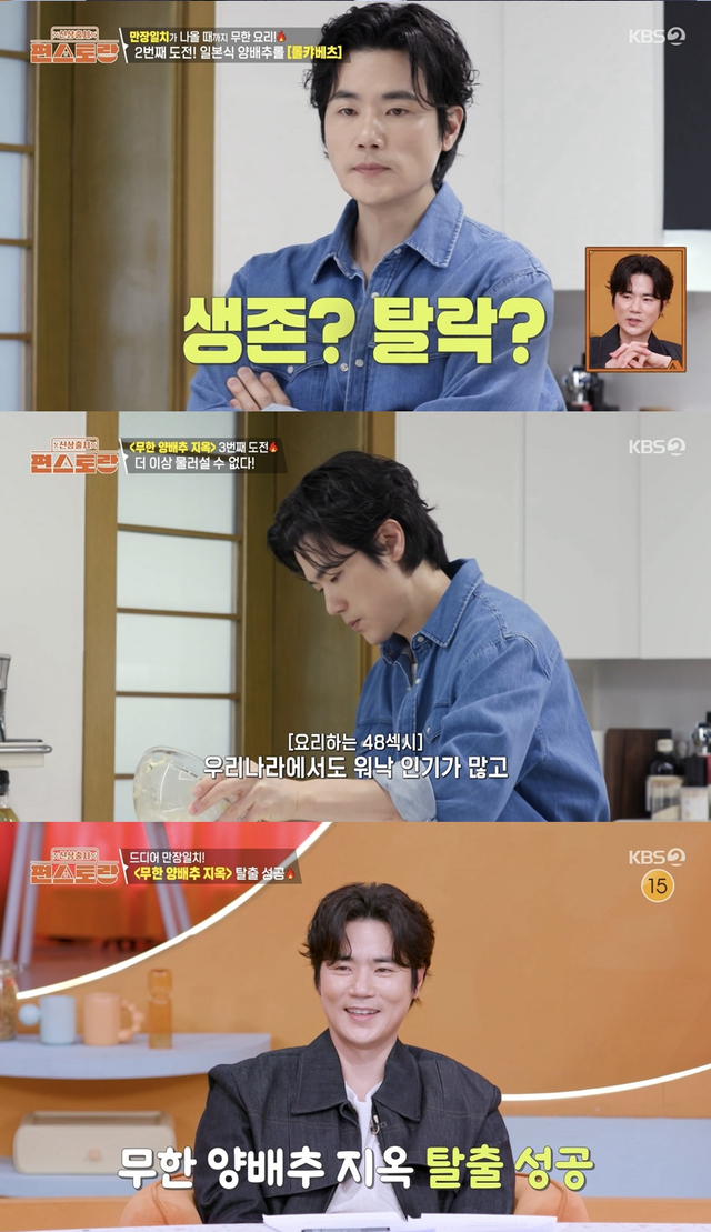 이후 김강우는 제작진이 준비한 ‘무한 양배추 지옥’ 미션에 투입됐다. 양배추를 싫어하는 MZ 제작진이 심사위원으로 나선 가운데, 모두가 만족할 때까지 양배추 요리를 계속 만들어야 하는 상황에 놓였다.