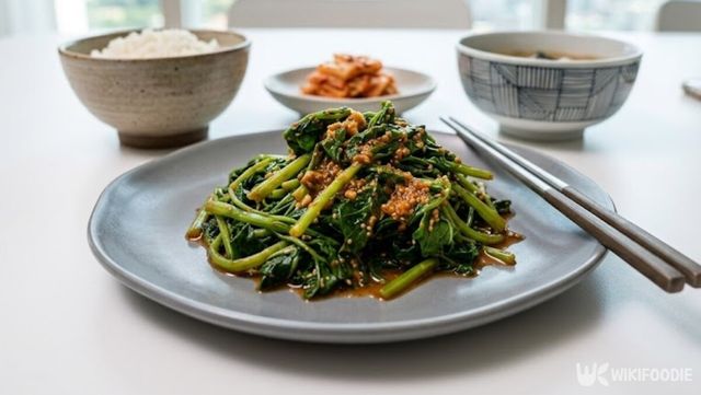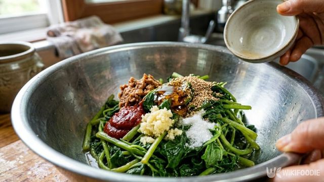 이후 양념을 더한다. 된장 1큰술과 고추장 1큰술을 넣어 기본 간을 맞추고, 다진마늘 2큰술을 더해 깊은 향을 살린다. 여기에 설탕 2큰술과 식초 1큰술을 넣으면 쌉싸름한 맛이 부드럽게 정리된다. 설탕이 단맛을 보완하고 식초가 전체 맛을 정돈한다. 마지막으로 참기름 1큰술과 통깨 1큰술을 더해 고소한 풍미를 완성한다.