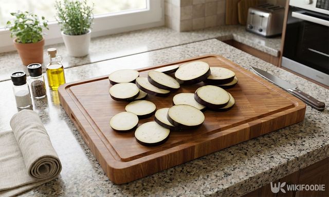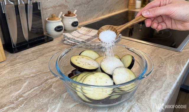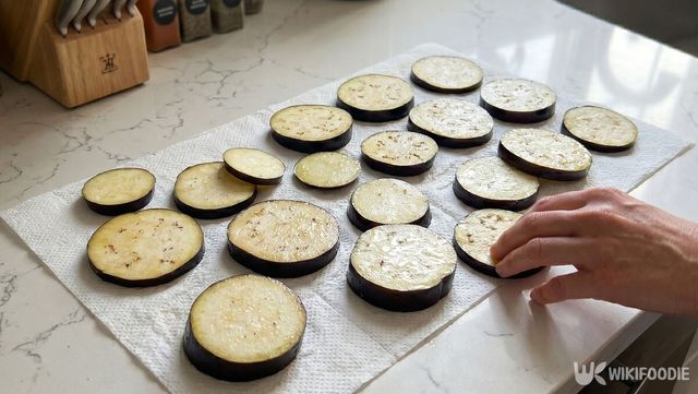 가지 1개를 0.8cm 두께로 썰어 소금을 뿌리고 15분간 둔다.