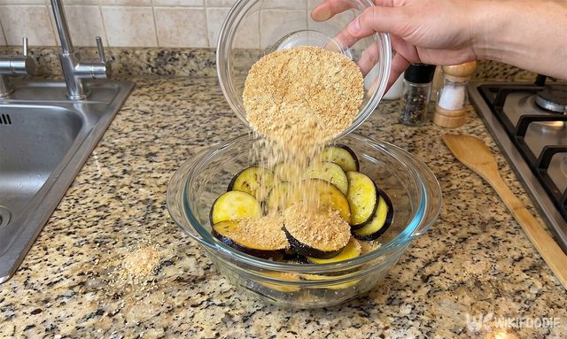 바삭한 맛의 중심은 빵가루와 향신료의 조합이다. 빵가루 1컵에 소금, 후추, 오레가노, 마늘 가루, 파프리카 가루를 섞는다. 마늘 가루는 가지의 담백한 맛에 깊은 풍미를 보태고, 파프리카 가루는 구웠을 때 먹음직스러운 색을 낸다.