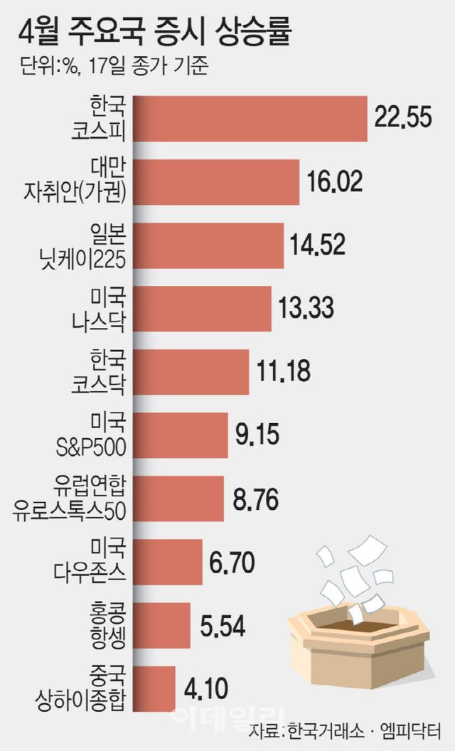 코스피 상승률은 대만 가권지수(16.02%), 일본 닛케이225지수(14.52%), 미국 나스닥 종합지수(13.33%)를 모두 웃돌았다. 미국 스탠더드앤드푸어스(S&P)500지수는 9.15%, 유로스톡스50지수는 8.76%, 미국 다우존스 산업평균지수는 6.70% 상승폭을 보였다. 홍콩 항셍지수와 중국 상하이종합지수는 각각 5.54%, 4.10% 오르는 데 머물렀다.
