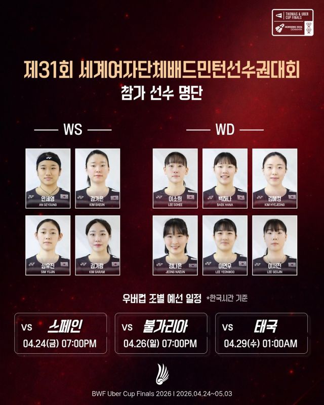 한국은 이번 대회에 안세영, 김가은(삼성생명), 심유진(인천국제공항), 김가람(정관장·이상 여자단식) 이소희, 이서진(이상 인천국제공항) 김혜정, 이연우(이상 삼성생명), 백하나(MG새마을금고), 정나은(화순군청·이상 여자복식)이 출전한다.