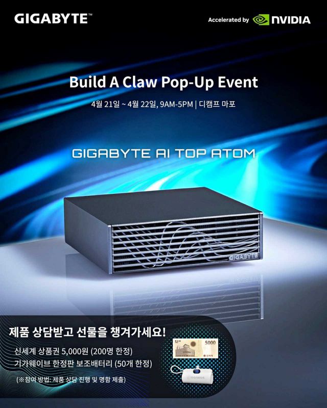 기가웨이브가 엔비디아 체험형 AI 행사 빌드 어 클로에 참여해 기가바이트 AI TOP ATOM을 전시하고 현장 상담과 예약 판매를 진행한다. AI 에이전트 구현 환경에서 제품 성능을 직접 체험할 수 있으며, 사전 구매 신청 고객에게는 별도 빌드 세션 예약 혜택도 제공된다.