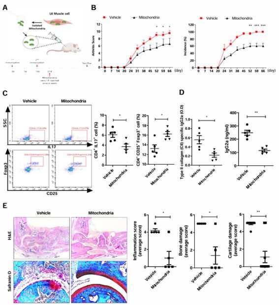 연구팀은 전임상 동물 모델(CIA 마우스)을 통해 미토콘드리아 이식이 관절염 지수를 획기적으로 낮추고, 파괴된 연골과 염증 침윤을 현저히 억제하는 탁월한 치료 효과를 확인했다.