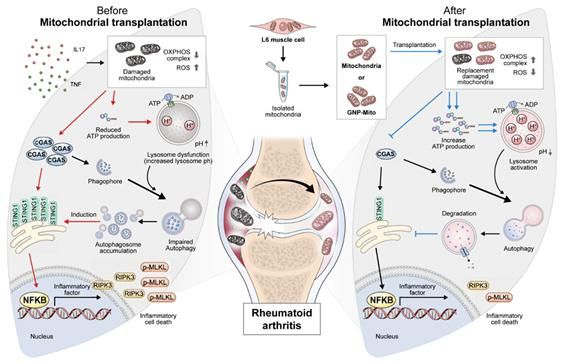 미토콘드리아 이식을 통해 자가포식 과정을 정상적으로 회복시켜 난치성 류마티스관절염 관절 활막세포와 면역세포를 동시 조절하고 질환을 치료하는 치료 효과를 최초로 규명했다.
