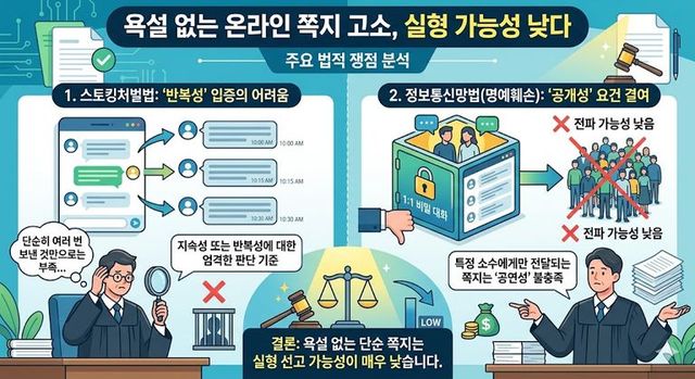 욕설 없는 온라인 쪽지 고소는 스토킹의 '반복성', 명예훼손의 '공개성' 쟁점으로 실형 가능성이 낮다. / AI 생성 이미지