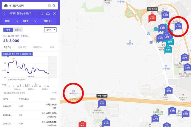 억대 현금이 3만 5000명의 손에 동시에 들어오는 상황이다. 이 돈이 부동산 시장에 흘러들면 어느 지역 집값이 오를까. 많은 사람들이 SK하이닉스 이천캠퍼스 인근을 먼저 떠올리지만, 실거래가는 그 반대를 보여준다. 이천캠퍼스 인근 부발읍 아미리 '현대성우2단지' 84㎡는 올해 3월 4억 2500만원에 거래됐는데, 이는 2023년 10월 최고가 5억 1500만원보다 오히려 9000만원 낮은 가격이다. 성과급 규모가 커지는 동안 이천 집값은 3년째 하락세를 이어가고 있다.
