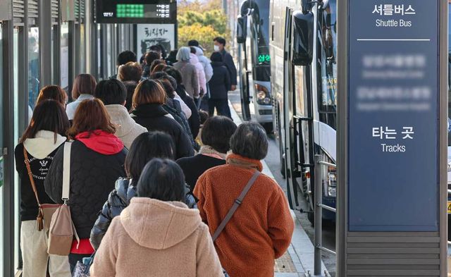 시민들이 셔틀 버스를 타기 위해 줄을 서 있다. / 뉴스1