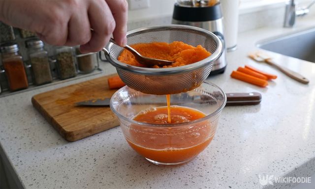 1. 당근 1개는 잘게 썰어 믹서에 갈고 채에 걸러 즙 100ml를 따로 받아둔다.