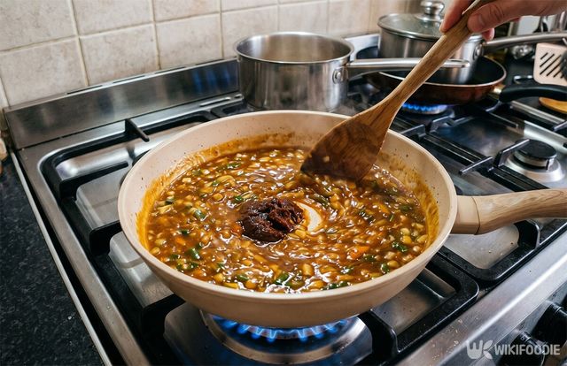 9. 불을 약하게 줄인 뒤 전분물을 조금씩 부어 소스를 걸쭉하게 만든다.