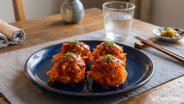 고기가 익는 동안 곁들일 소스를 만든다. 팬에 닭육수와 다진 대파, 두반장, 그리고 만들어둔 당근즙을 넣고 끓인다. 약불로 줄인 뒤 전분물을 조금씩 나누어 넣으며 걸쭉하게 농도를 맞춘다. 접시에 잘 익은 새우볼을 옮겨 담고 그 위에 소스를 듬뿍 끼얹으면, 당근의 단맛과 새우의 고소함이 조화를 이루는 근사한 한 접시가 완성된다.