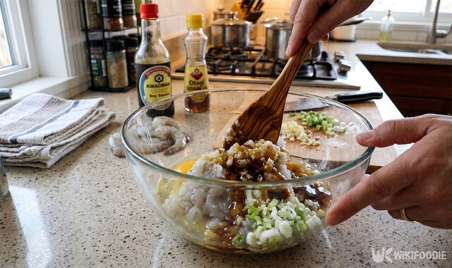 손질한 새우에 계란 흰자와 다진 마늘, 다진 대파를 넣는다. 여기에 감칠맛을 내는 굴소스와 참기름을 더해 밑간을 한다. 전분 한 큰술을 넣고 손끝으로 1분 정도 치대면 반죽에 기분 좋은 끈기가 생긴다. 너무 오래 치대면 질겨질 수 있으므로 살짝 끈적거리는 상태에서 멈추는 것이 좋다.
