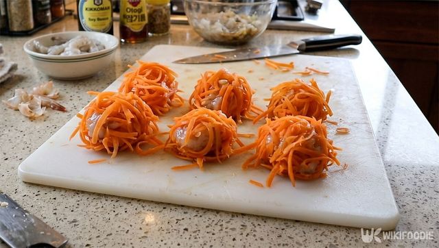 이제 새우 반죽을 한입 크기로 동그랗게 빚는다. 미리 준비해둔 당근 면 위에 반죽을 올리고 돌돌 감싸 형태를 고정한다. 손바닥 위에서 가볍게 굴려 마무리하면 당근의 선명한 주황색이 새우를 감싼 예쁜 모양이 나온다.
