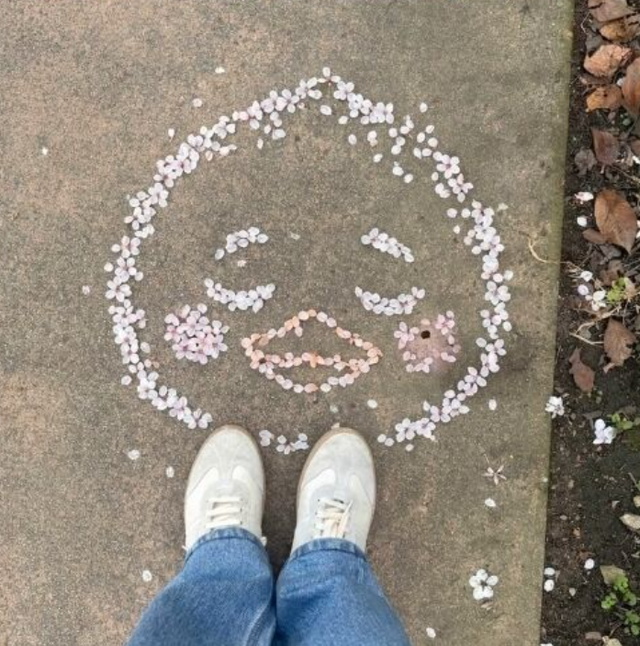 ‘남친짤’ 외에 눈길을 끈 사진은 벚꽃잎으로 만들어 낸 병아리 캐릭터다. 아이유의 SNS 프로필 사진으로 알려진 캐릭터인 트위티 버드를 연상시키는 캐릭터라 자연스럽게 그의 여자친구인 아이유를 떠올리게 한다,