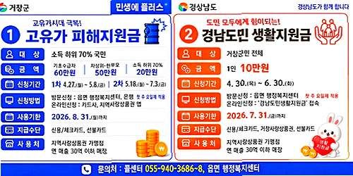 연합뉴스에 따르면, 거창군이 '고유가 피해지원금'과 '경남도민 생활지원금' 신청 접수를 잇따라 개시한다.